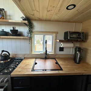 The cover on the sink is NOT a cutting board. There is a black cutting board provided for you. Be conservative with your water use. The water you bring goes under the sink. It flows to the kitchen and bathroom faucets.